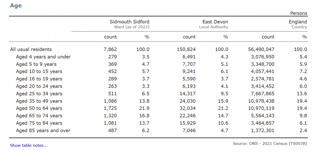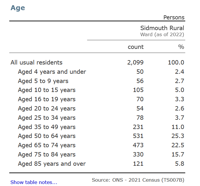 You can find the Office for National Statistics website here at Nomisweb Type Sidmouth in the search box and you will be able to choose which Ward you want to view. The statistics make interesting reading. Below are the extracts for age ranges. Does the higher percentage of over 85s in Sidmouth Town reflect the accommodation available, eg housing limited to over 50s? Go to the link above to compare housing and many other interesting facts.