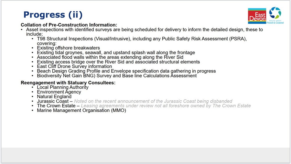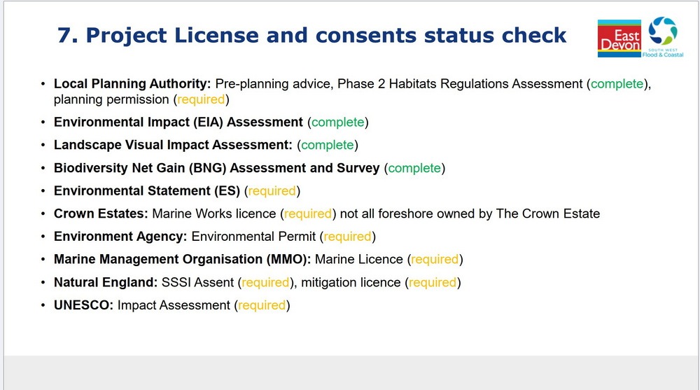 3) work in the sea does not usually require Planning Permission as it is handled through other mechanisms but work onland will have to go through the EDDC Planning process. So there may be one or unusually two applications when we get to that stage.
