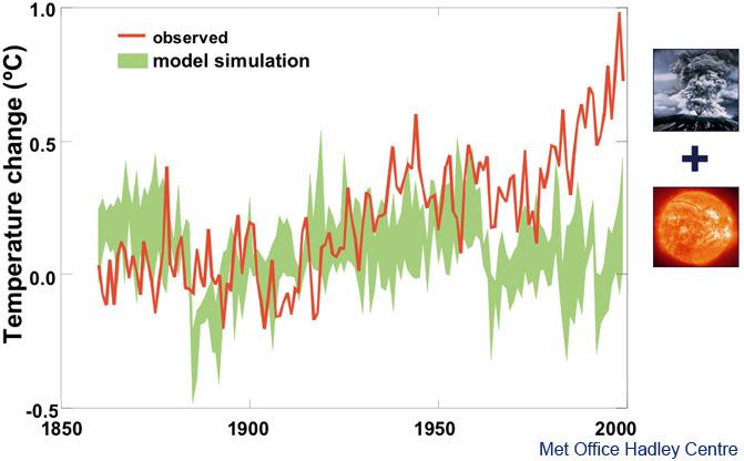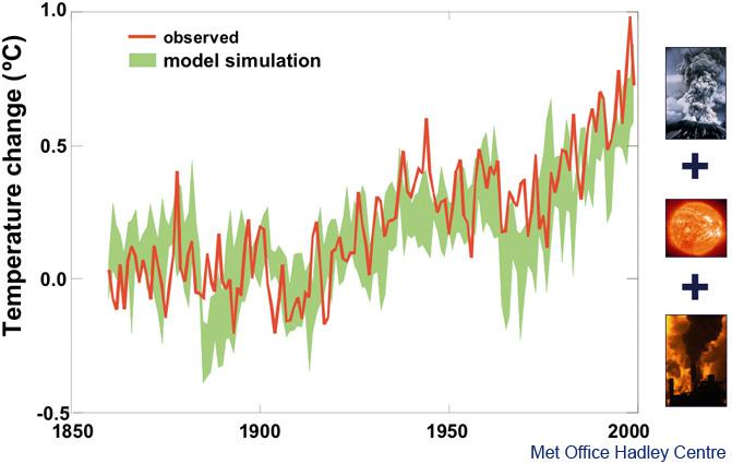 Climate models, like weather prediction models, are based on the laws of physics that govern how the atmosphere will behave. By carrying out “what if” experiments, scientists can use the models to help their understanding of why climate is changing. The pictures below show reconstructions of global temperature (the green bands) compared with measured temperatures (red line) from 1850 to 2000. The only difference in the two graphs is that changes in carbon dioxide are omitted from the one on the bottom. Both contain recorded changes in solar radiation and the effects of volcanic eruptions. The top picture, in which the impact of carbon dioxide is included, matches the observed trends much more accurately, confirming that the processes represented in climate projections reflect the observed historical changes to a good approximation when the changing concentration of carbon dioxide is included. Note that the carbon dioxide effect (shown by the difference between the green band in the top and bottom pictures) begins to become significant from about 1960, when the post-war recovery really got underway, but that a natural reduction at that time due to volcanic eruptions compensated to keep temperatures down.