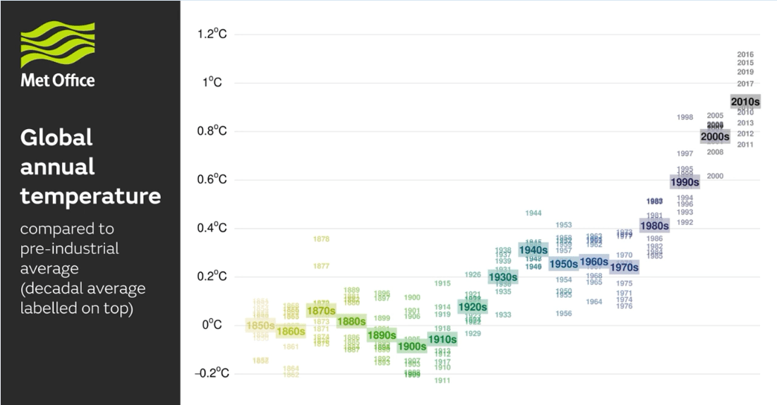 - Global temperatures have increased decade-on-decade since the mid-20th Century, consistent with the basic physics.