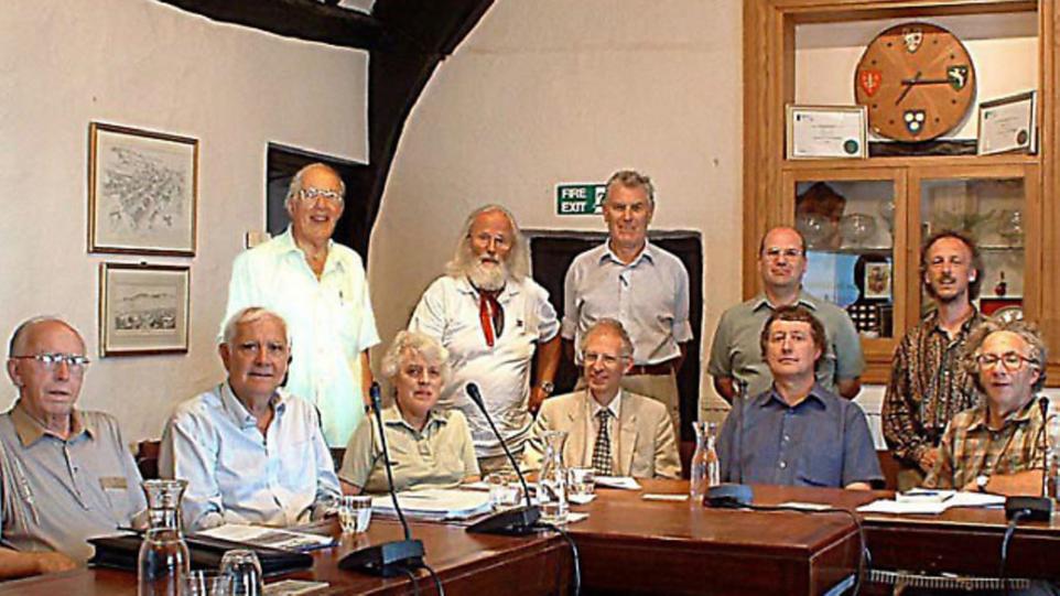 Front row: Alan Hunt [Midland Bank retired manager], Cllr. Tom Cox [Sidmouth Town Council deputy chair], Cllr. Ann Liverton [STC chair and VGS chair at its founding], Prof Brian Golding [Met Office], Alan Darrant [SVA secretary and VGS chair], John Rayson [EDDC retired officer]