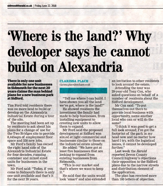 The front page of today’s Herald announces that the site for an industrial estate at Sidford is to be sold: