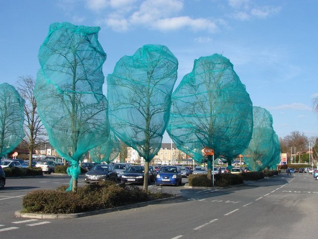 In preparation for development work at Sainsbury’s Brookwood branch the trees that are going to be removed have been wrapped in netting to prevent birds from nesting resulting in this wonderful idiosyncratic view.