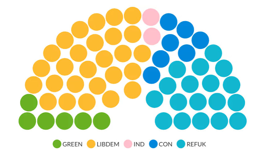 Meanwhile, the results next door are very similar, in that there is now no overall control of Cornwall Council after all the seats are declared – as Reform secures 28 seats, the Lib Dems 26.