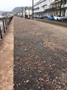 The images above show where the pebbles have been left and this indicates where large amounts of water reached. They show that the current dwarf wall did a very good job of containing most seawater overtopping to the Esplanade. Very little made it over on to the road. The place where the shingle was thrown on to the Esplanade was where the beach is very low.