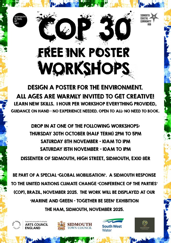 And as of Thursday 30th October (also next week as part of half term), as part of COP 30, Sidmouth School Of Art will be working to create “a visual response to the United Nations Climate Change Conference in November 2025 in Brazil” – with a new project inspired by and coordinated by Brazilian Sidmouth Resident and artist Lucia Cooper with the support of her family and Maureen and Mike Hawkridge.