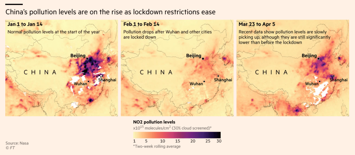 “But the same story also cautions against expecting this change to last. FT analyzed data from China, which is slowly recovering from its initial outbreak. Pollution levels there are back on the rise, suggesting other cities might follow a similar pattern.”