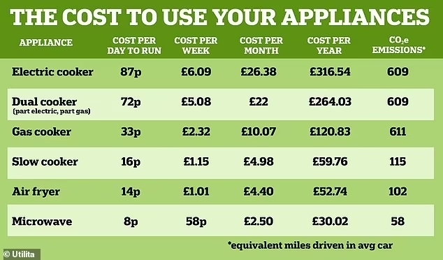 For households looking to save money on their energy bills, the research suggests a microwave could be the most economical option, costing 8p a day to run, equating to 58p a week, just £2.50 a month and £30 a year.