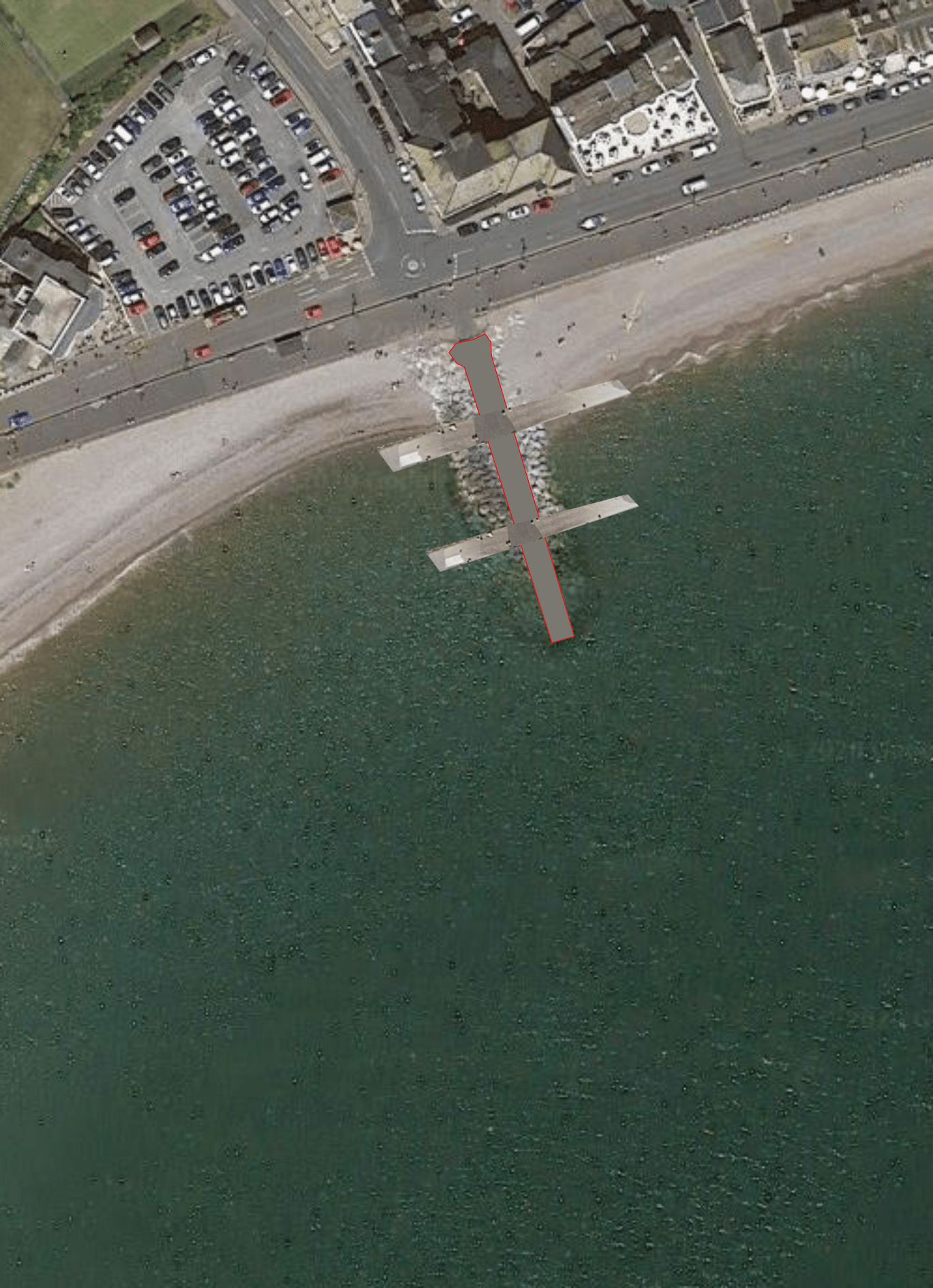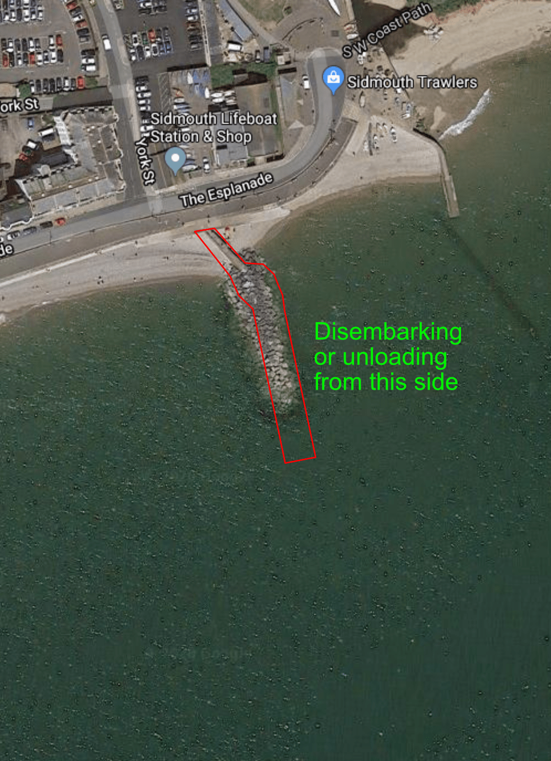 The current groyne at Port Royal contains an angle with the concrete pier meeting the top of the ramps at a place which could be widened. If this was widened and the building of the slipway allowed for the manoeuvring of the Lifeboat tractor and reaching deeper water it might look something like the following image.
