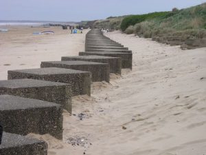Some blocks were placed during WWII as beach defences against invasion, could this sort of block arrangement (perhaps in two staggered rows) help retain the shingle and give people places to sunbathe?