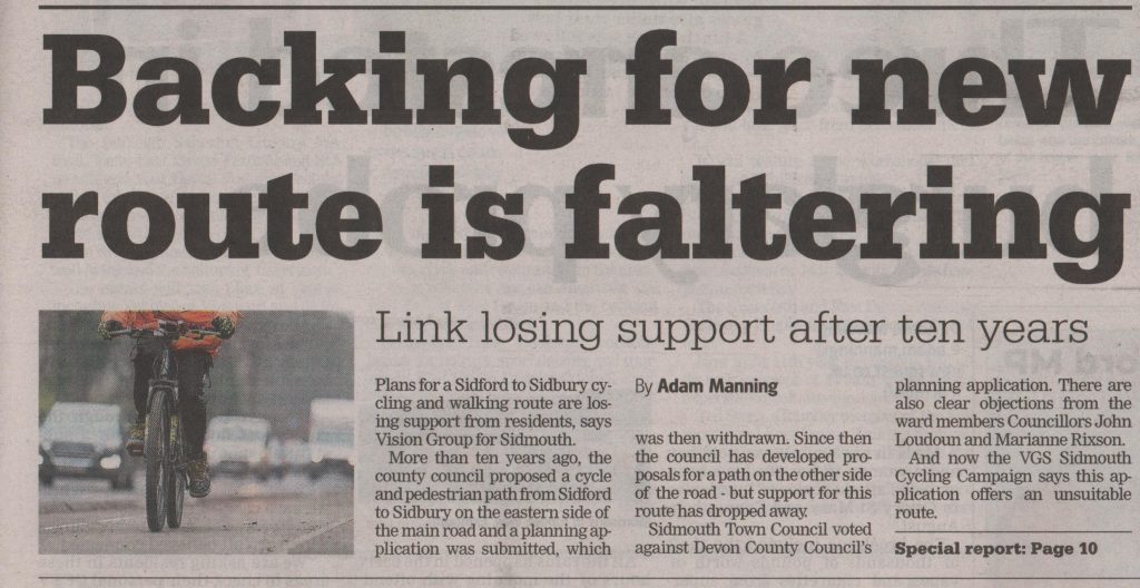 The Sidmouth Herald has taken the story and has published it online as ‘Sidford to Sidbury Cycle/Footpath is losing support’ – and they have put it on the front page of their latest edition: