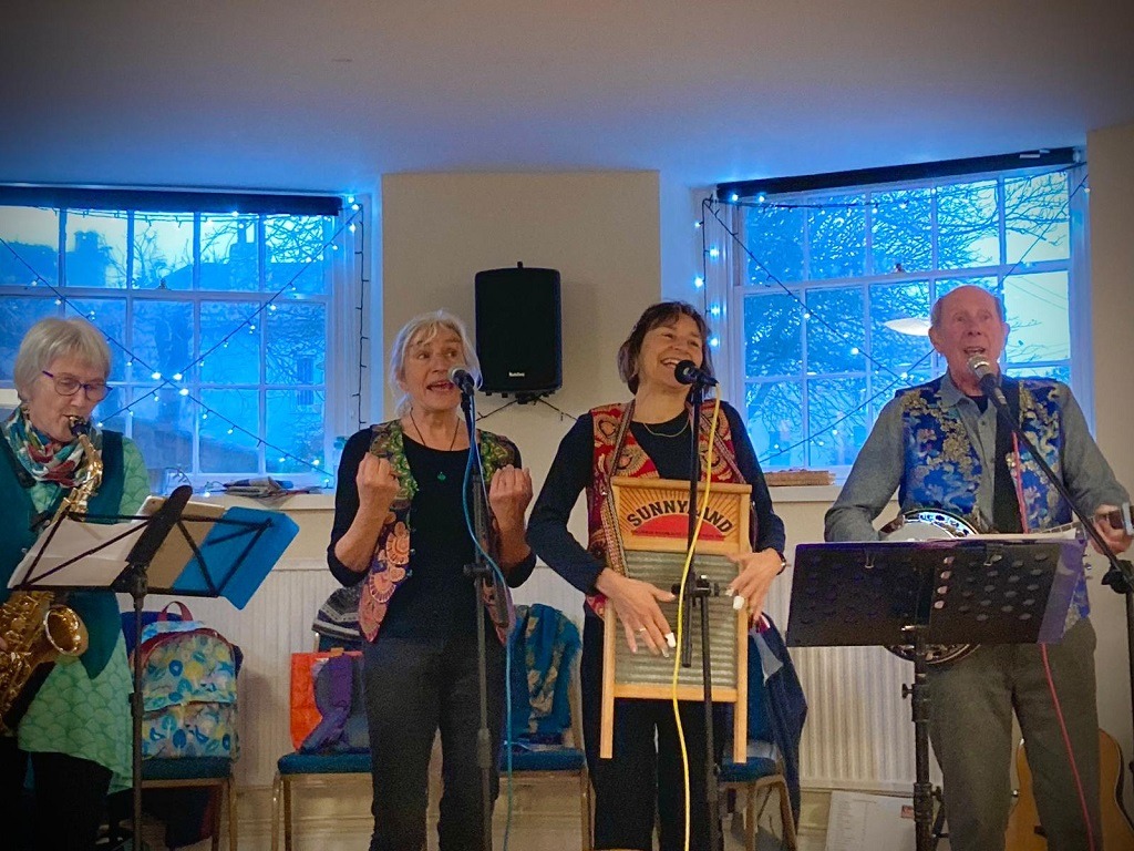 The Three Cornered Plot (plus one!) band entertained all at the other end of the Cellar Bar – all tree and leaf themed songs of course.